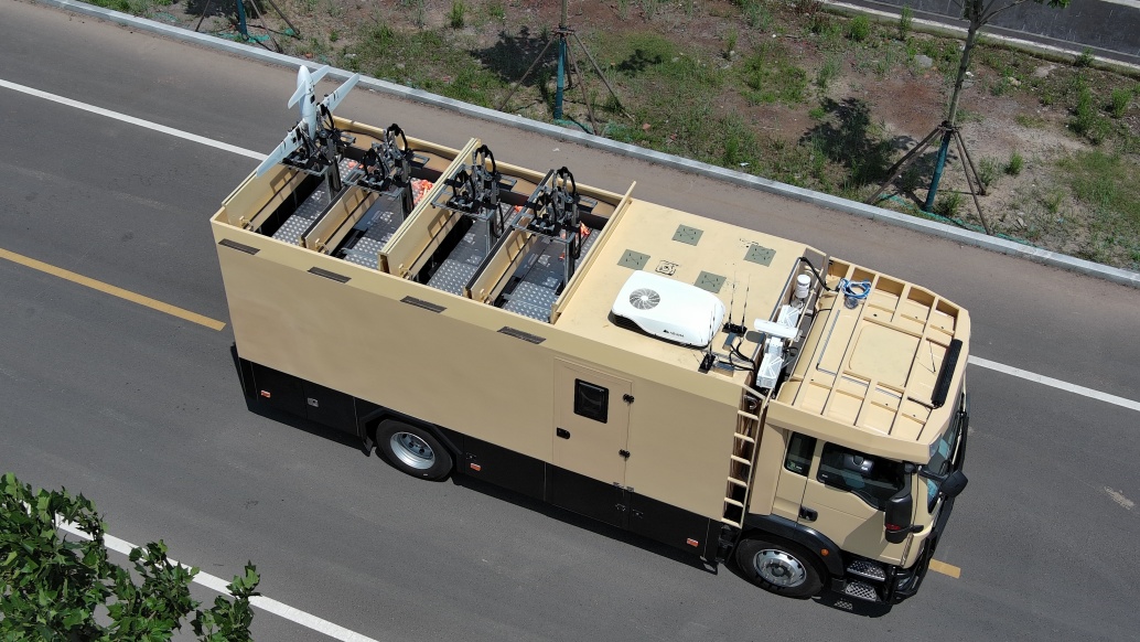 可用于搭載和調(diào)度多架無(wú)人機(jī)的重型卡車(chē)平臺(tái)。具備強(qiáng)大的承載和運(yùn)輸能力、多無(wú)人機(jī)聯(lián)合作業(yè)支持、以及多聯(lián)指揮調(diào)度功能。