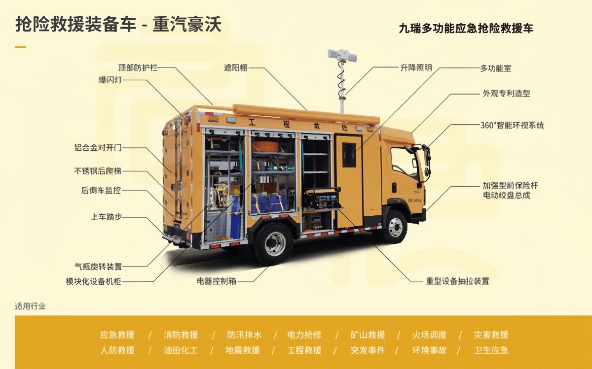 整車帶液壓動力,滿足應急現(xiàn)場的破拆、支撐、排風、拖拽、焊接等救援功能