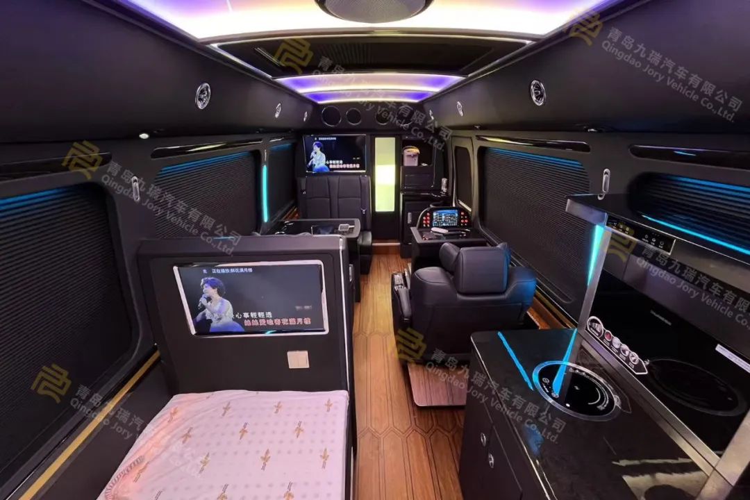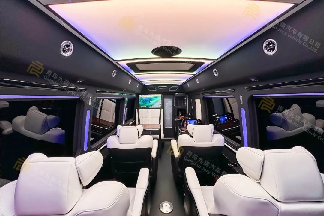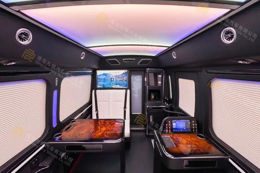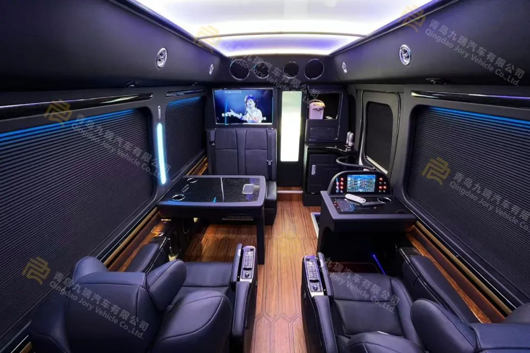 九瑞商務(wù)車,內(nèi)飾精致,工藝卓絕。儀表盤、中控臺、車門、座椅縫線皆顯品質(zhì),新添折疊秘書桌、220V 電源接口,讓工作娛樂隨心。車載冰箱、側(cè)旁雨傘槽、一體式座椅、電動(dòng)踏板、隱私玻璃、換氣扇俱全,舒適便捷,豪華盡享。