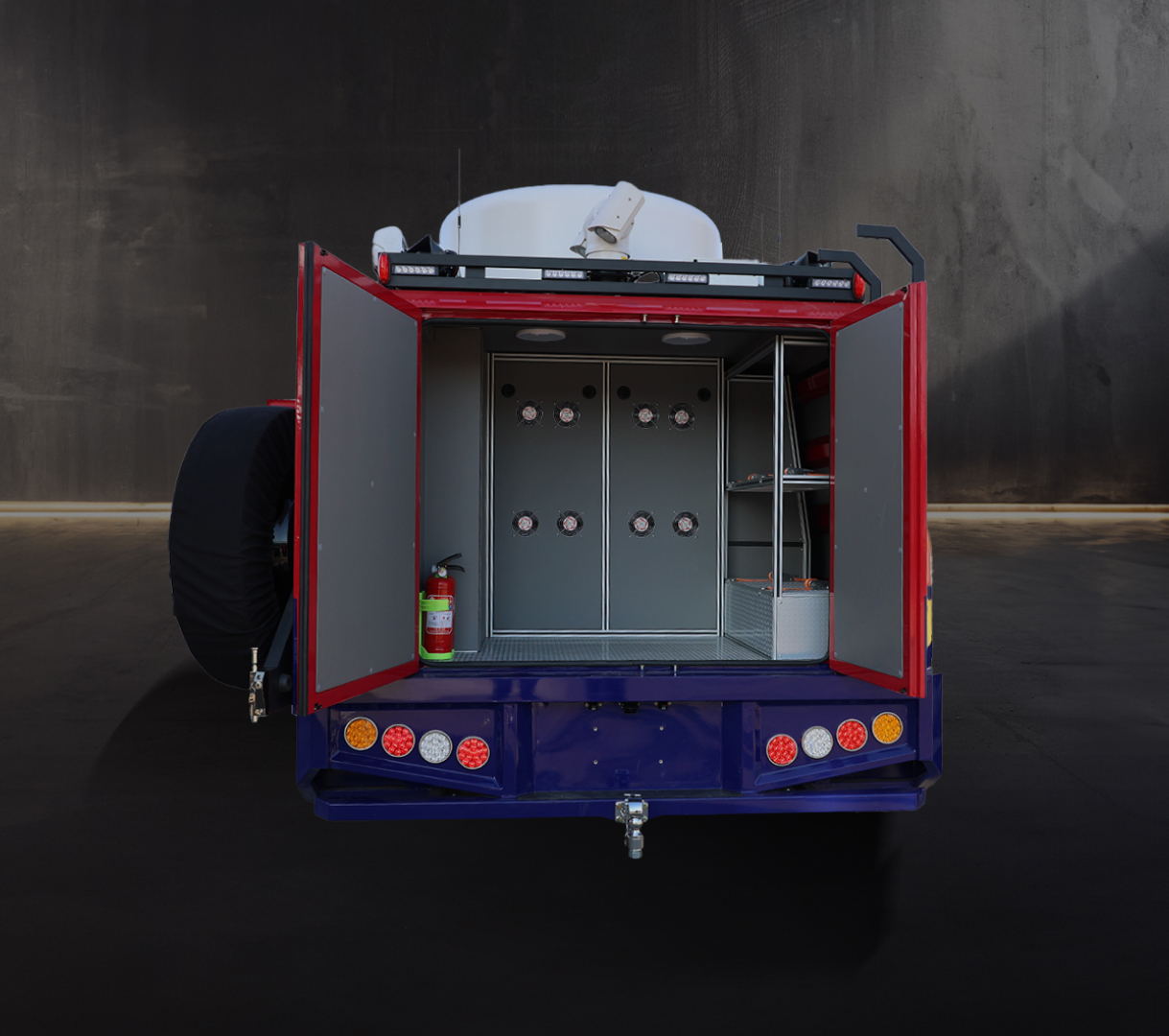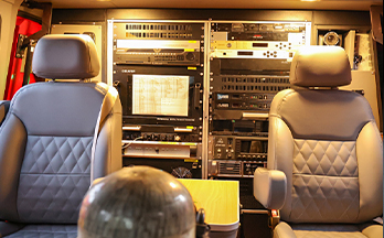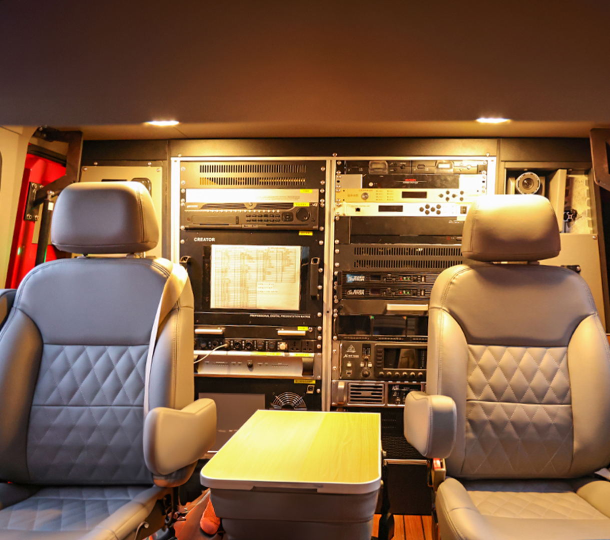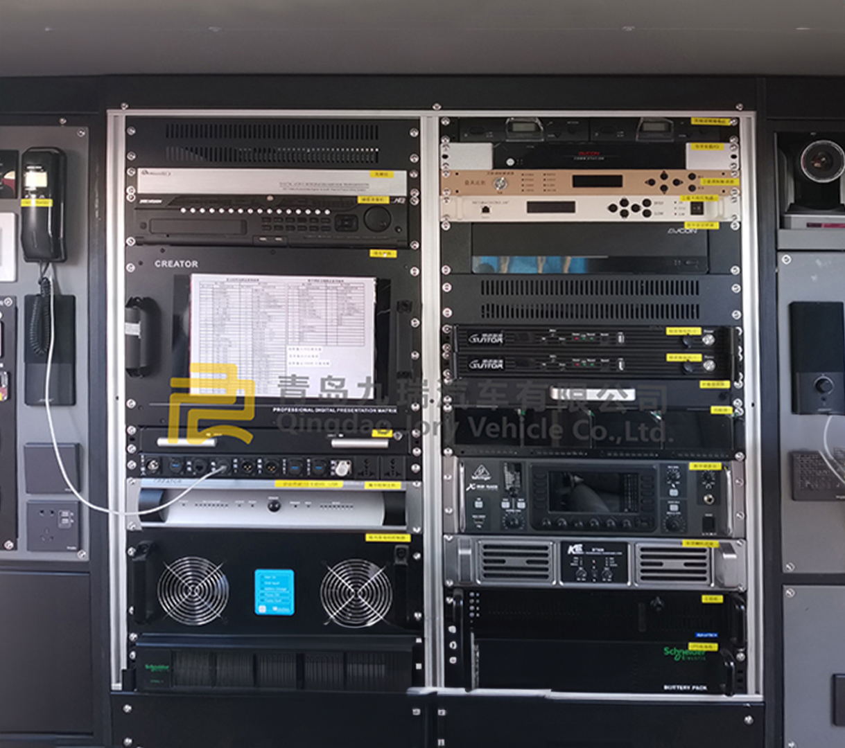 九瑞牌福特F550通信指揮車車內(nèi)平臺(tái)按功能分為三段,前部駕駛艙、中部操作艙、后部設(shè)備艙;操作艙設(shè)有兩個(gè)可旋轉(zhuǎn)座椅,方便進(jìn)行通信設(shè)備操作;后部設(shè)備艙可配備電纜盤、發(fā)電機(jī)控制單元、UPS主機(jī)、蓄電池、雜物柜,設(shè)備配重布局合理,安裝平衡穩(wěn)固。